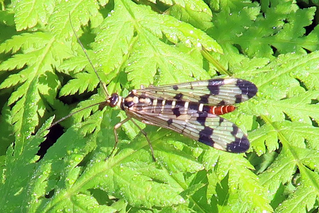 Jeg fandt et billede af en Almindelig Skorpionflue, som jeg fandt i en Sødskærm i haven i juni måned.
