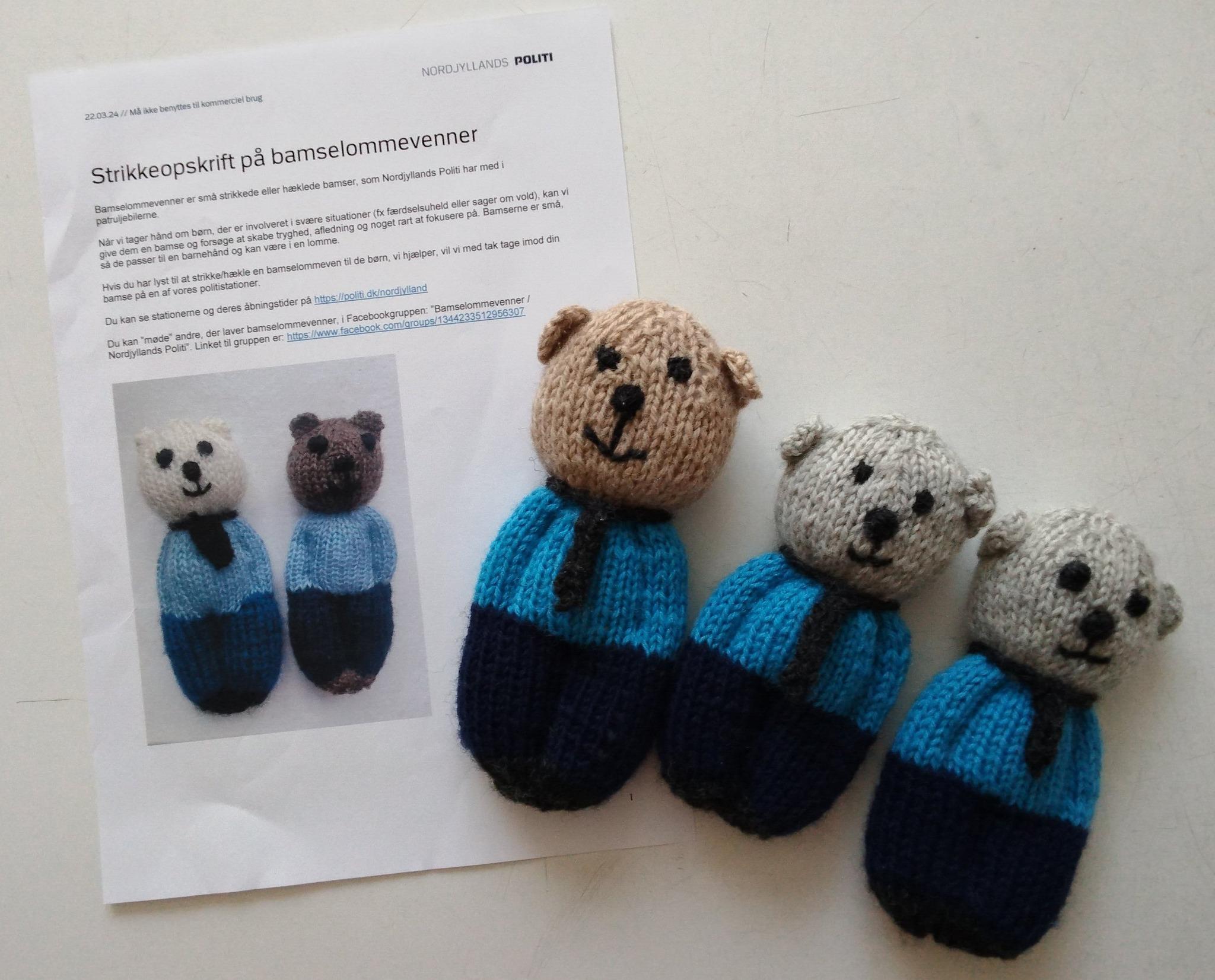 De er ret nemme at lave. Jeg har pt. lavet tre, og flere er på vej.Mange steder i landet modtager politiet små hjemmestrikkede eller hæklede bamser ("bamselommevenner"), som de giver til børn der har oplevet noget skræmmende. Der er opskrifter og mere info på denne side: https://politi.dk/om-politiet/virksomheden/bamselommevenner De er ret nemme at lave. Jeg har pt. lavet tre, og flere er på vej.0 Kommentarer 0 Delinger 58 Visninger -