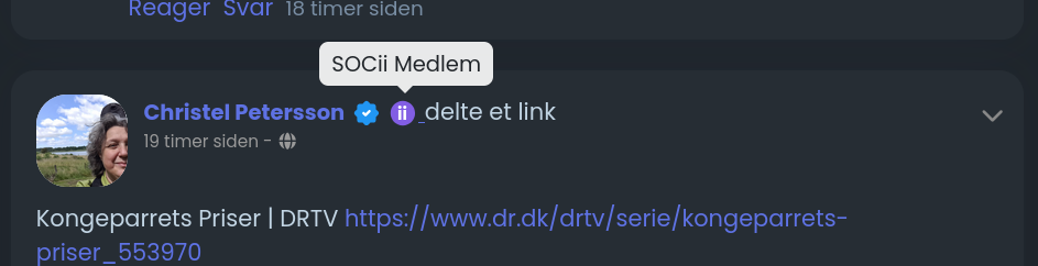 Nu har vi gjort det lidt sjovere at give en donation til SOCii, ved at man får vist et mærke ved ens profil. Mærket linker til siden: https://socii.dk/static/stoette - der nu gør det tydeligere hvordan man kan støtte SOCii platformen. Alle der har givet en donation har fået mærket.