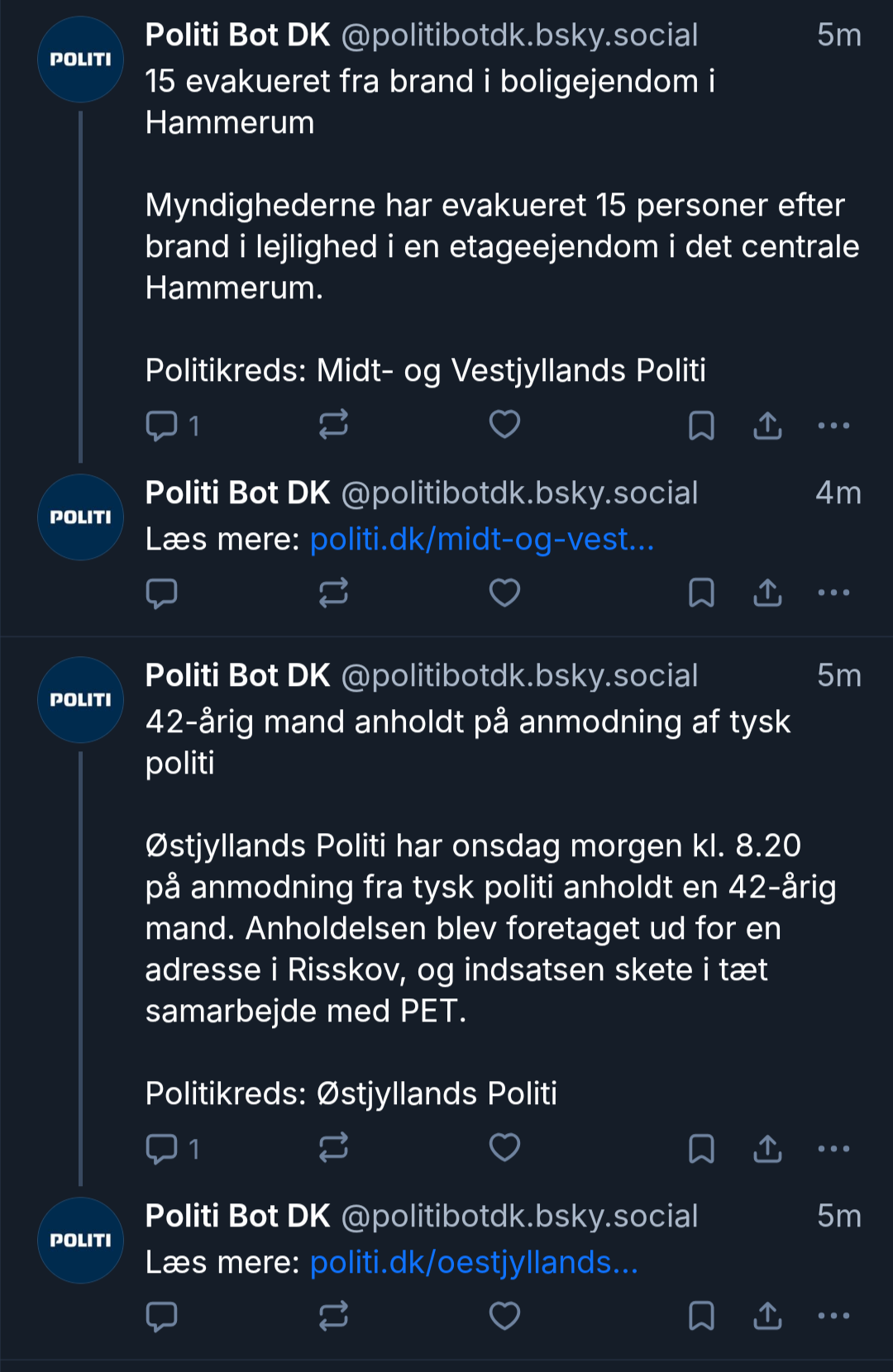 🚨 Velkommen til Politi Bot DK! 🚨 Følg os for nyheder fra alle politikredse i Danmark! 🇩🇰 Vi opdatere dig på nyheder hver dag uredigeret fra politiet. 📡 Data fra: https://mnlk.dk/vsaul 🤖 Tjek også lige https://socii.dk/pages/brandbotdk ud for nyheder fra brandvæsnet i Danmark. ❤️ Støt os: brandbot.dk/donate