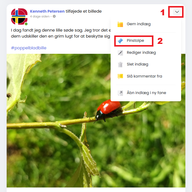 1. På det ønsket indlæg klikkes på pil ned i øverste højre hjørne.