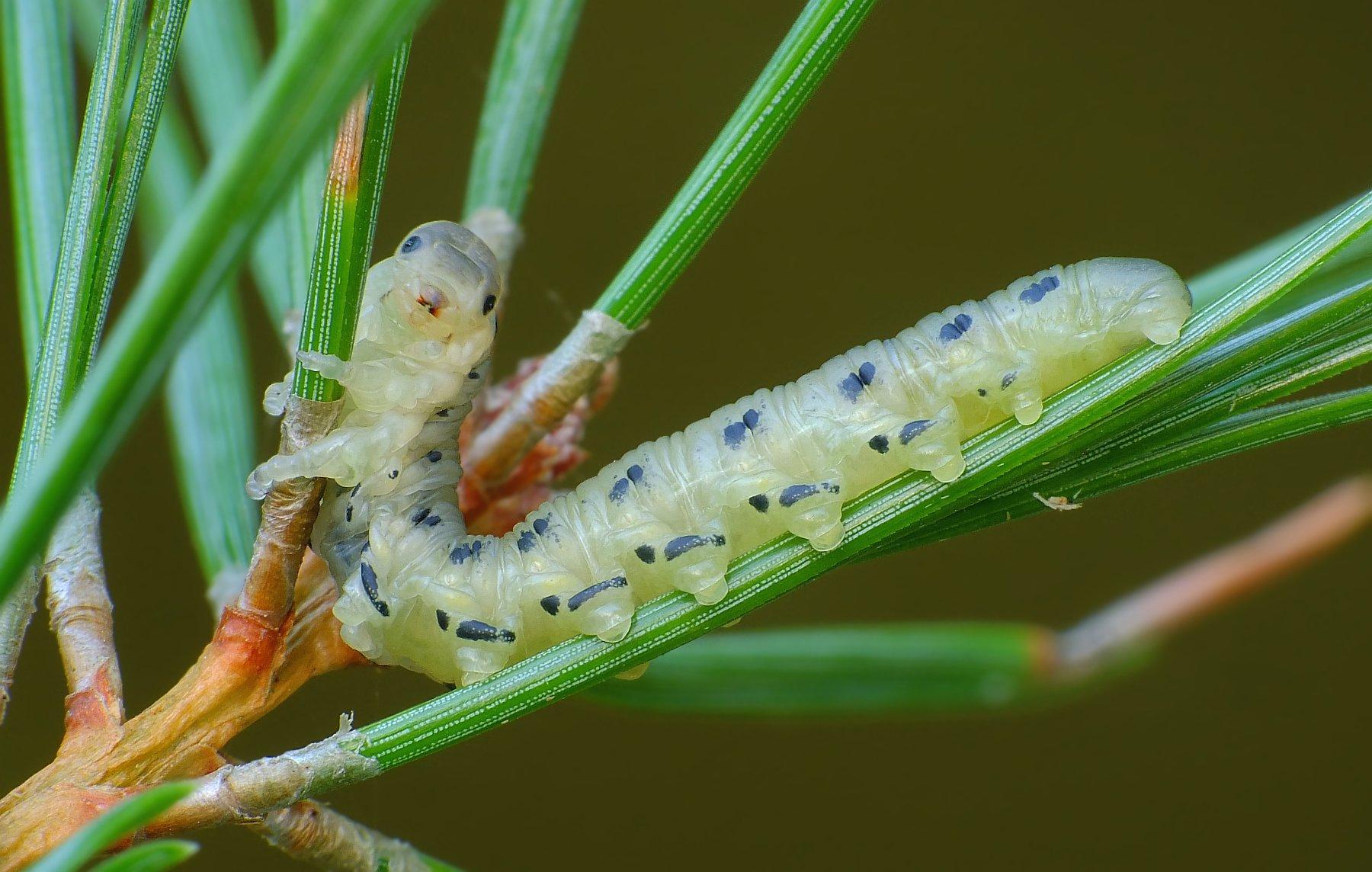 Dagens Fyrrehveps: Almindelig fyrrehveps - Diprion pini .. men med et specielt udseende Den er nemlig i eonymph-stadiet, dvs den har skiftet udseende, og er ved at gøre klar til at kravle i jorden Her ligger den så, muligvis i en kokon, muligvis blot i en hule - vinteren igennem og forpupper sig først i foråret Længde: 27 mm - på Fyr i dag, Grenå kommuneplantage