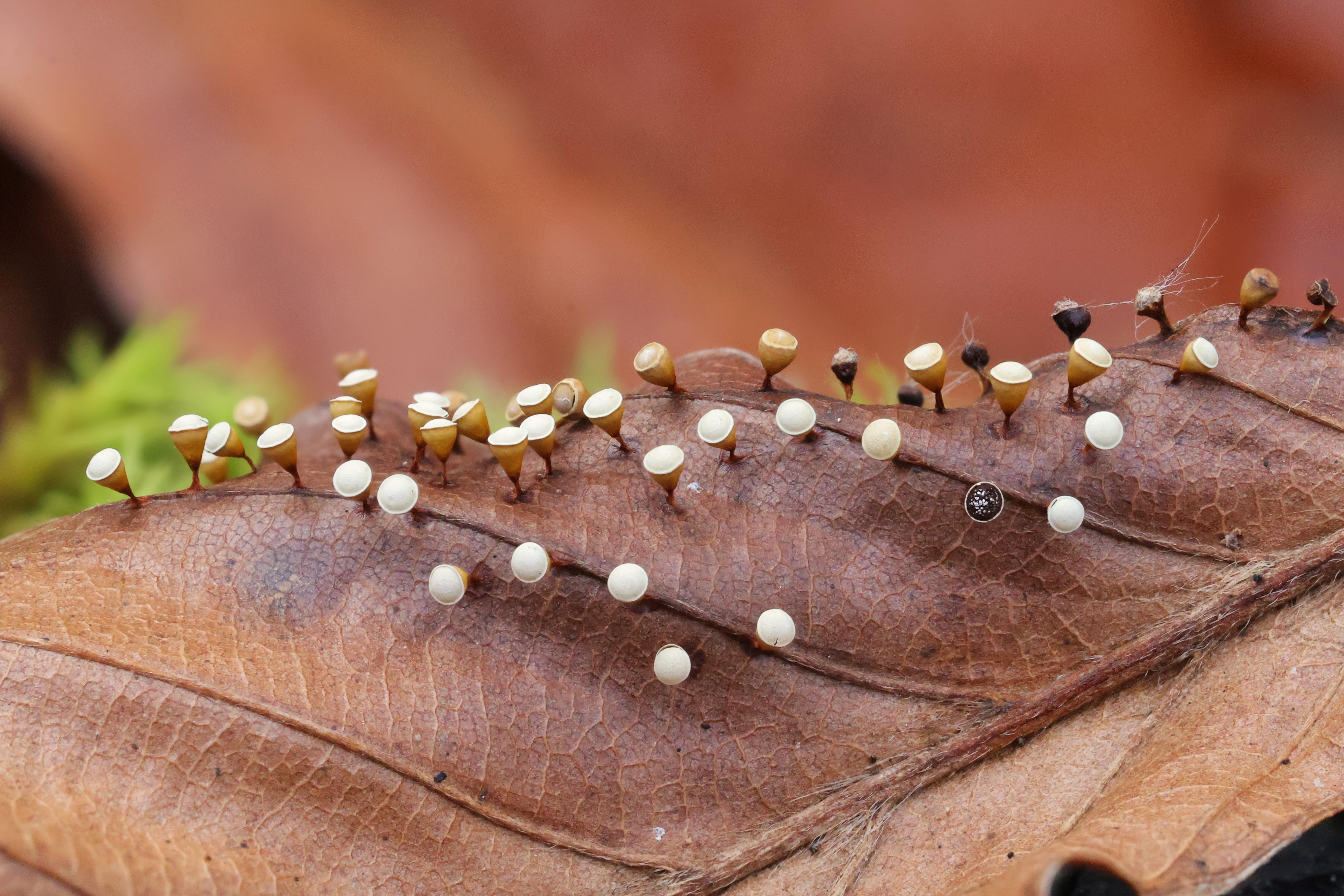 Disse helt utrolig smukke bittesmå Kantet dværgpokal- Craterium minutum på blot ca. 1,5 mm. vokser på et lille Bøgeblad, og er på alle måder fantasiske.