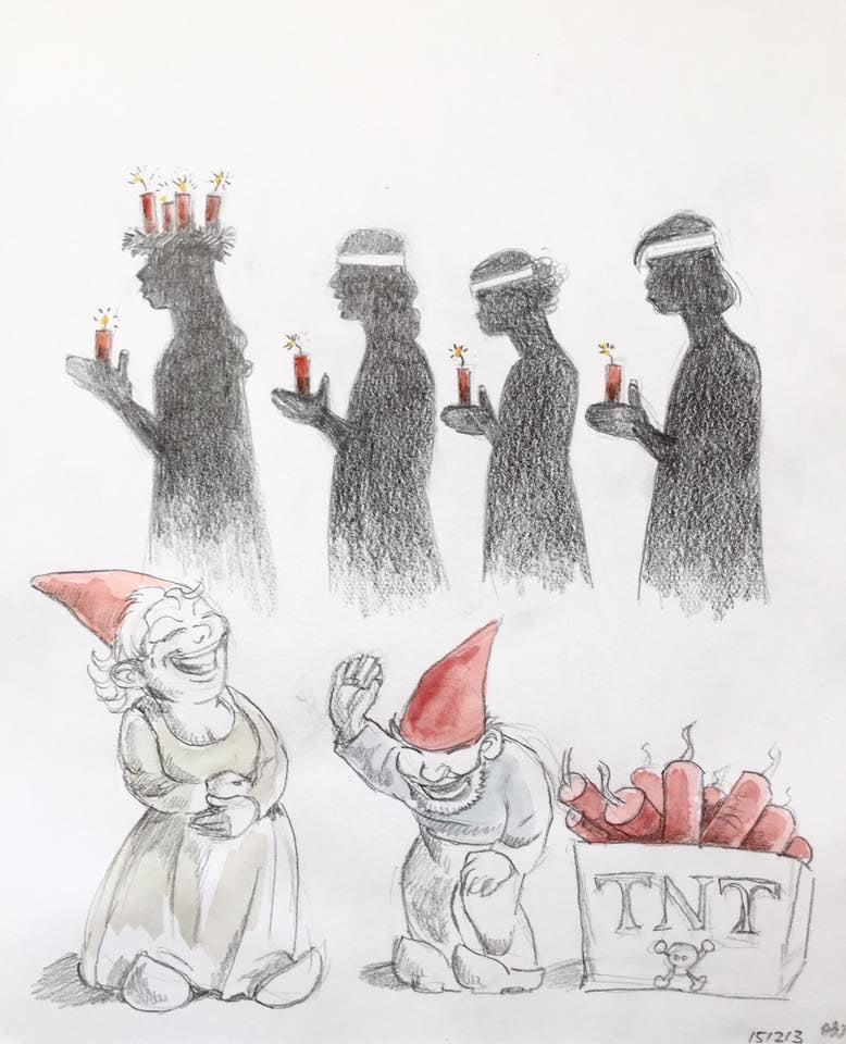 13. december. Nisserne hjælper selvfølgelig også med afviklinger af Luciaoptoget. Her har de leveret de fine lys. #nisser #julekalender2025 #julen2025 #illustration #art #lucia