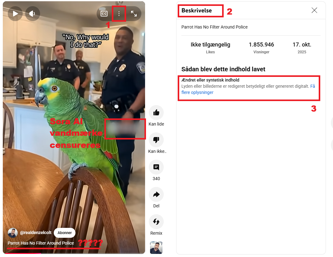 Opdag AI imellem ægte indhold Hvordan kan du se når noget er kunstigt skabt og ikke er en del af virkeligheden. - Det kan fremgå i titlen, men sker meget sjældent - Et mindre område blive censoreret kan være et vandmærk fra f.x Sora AI På YouTube kan du i nogle tilfælde finde en note i beskrivelsen: 1. Klik på de 3 lodrette prikker 2. Klike på "Beskrivelser" 3. Se en note om Sådan blev dette indhold lavet. - Ændret eller syntetisk indhold Lyden eller billederne er redigeret betydeligt eller genereret digitalt. Det er interessant at gå kommentarerne igennem for at se hvad folks indtryk er og at der er ikke meget der indikere, at de ved at den er kunstrig fremstillet eller delvis kunstig. Enkle kommentar - Lol. is this parrot for real - Is this bird for real - 1 min silence, the ppl thinks it is real Hvis folk selv har lyst til at se den og føre sig selv mere robuste til at spotte kunstigt indhold. Det kunne også være fokus, men læg også mærke til hvordan den 1 betjents ansigt er mere sløret end hans uniform. https://youtube.com/shorts/zSxcqYB2g00?si=iqHglEWzVpp38M_j #ai