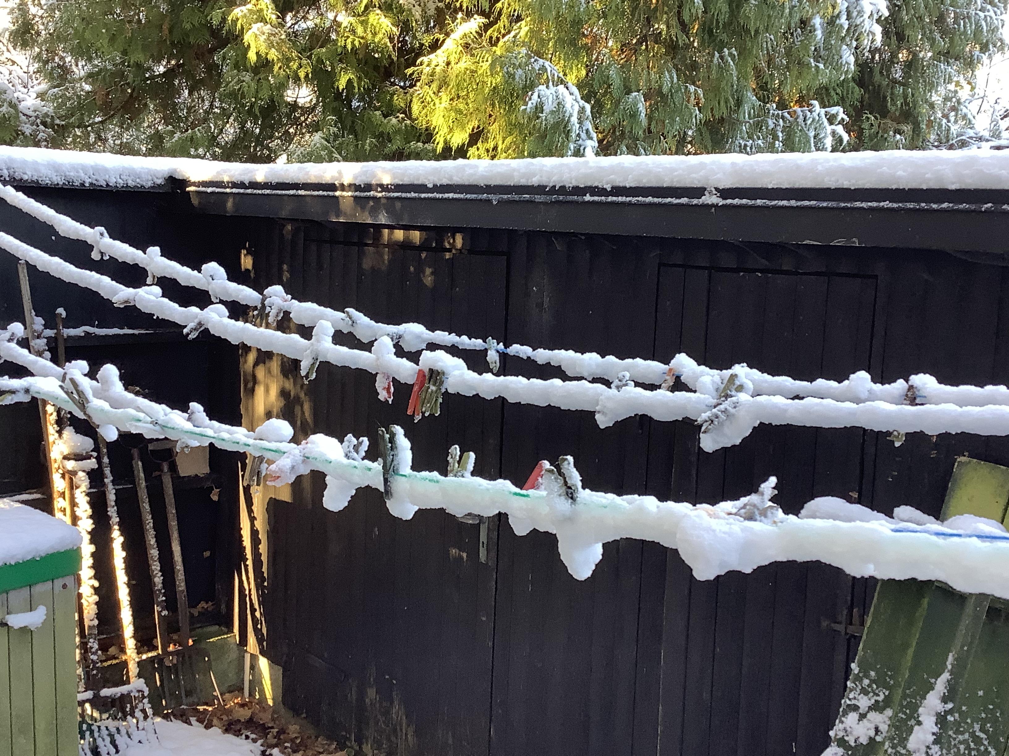 Det siger lidt om sneens kvalitet, at den formår at holde sig fast på tøjsnoren 😄