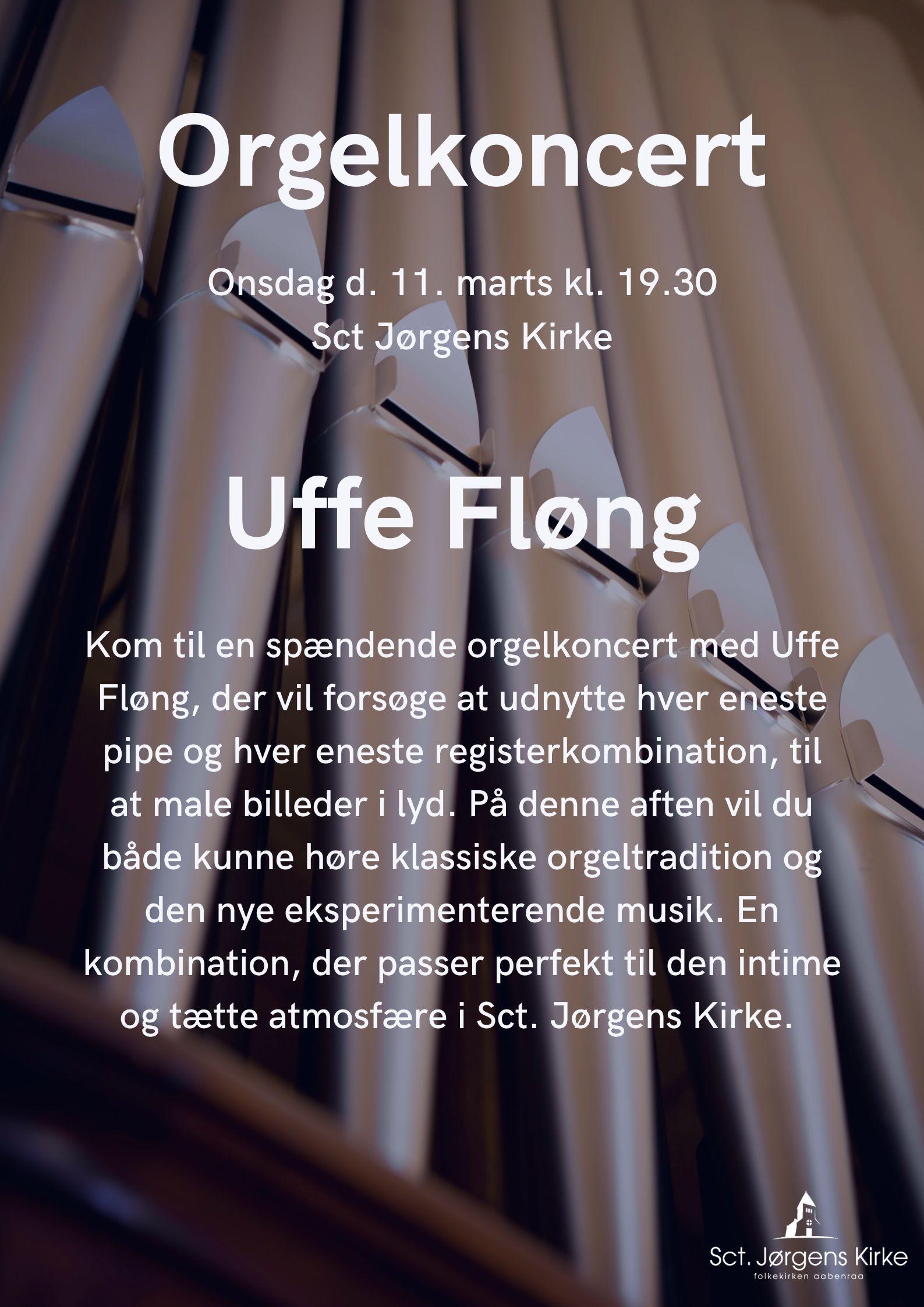 Kom til en spændende orgelkoncert med Uffe Fløng, der vil forsøge at udnytte hver eneste pipe og hver eneste registerkombination, til at male billeder i lyd. På denne aften vil du både kunne høre klassiske orgeltradition og den nye eksperimenterende musik. En kombination, der passer perfekt til den intime og tætte atmosfære i Sct. Jørgens Kirke.